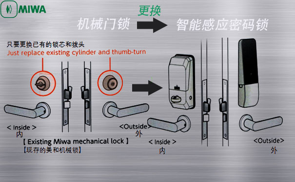 如果我們家里已經(jīng)是用的MIWA美和鎖,我想把入戶門鎖換成感應密碼鎖,可不可以呢?回答是肯定的,只需要換鎖芯旋鈕就可以了,一把新型的感應密碼入戶門鎖就組成了,它將牢牢地守住咱們溫暖的家。